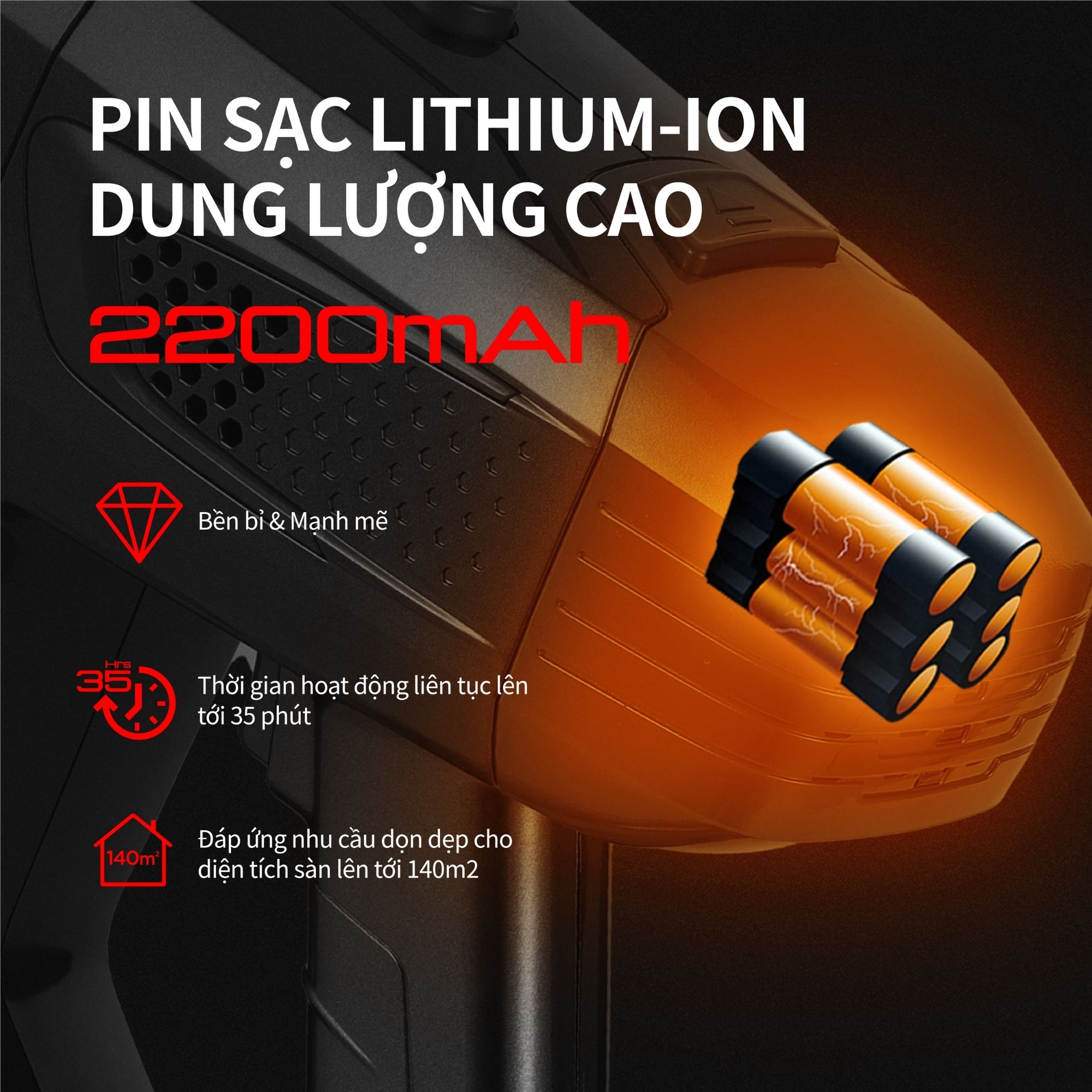 Pin Lithium 2200mAh, giúp người dùng liên tục đến 35 phút. Cộng thêm màng lọc Hepa, loại sạch đến 99,97% vi khuẩn và bụi bẩn. Lực hút cực mạnh bởi công nghệ Power cyclone.