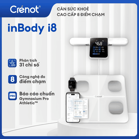 Crénot inBody i8 tự hào là dòng cân điện tử sức khỏe tiên tiến nhất hiện nay. Vượt xa so với các loại cân đo chỉ số thông thường chỉ đo được nửa dưới cơ thể, inBody i8 sở hữu 8 điểm chạm, cho phép đo toàn bộ cơ thể với độ chính xác lên đến 99,86%. Báo cáo phân tích toàn diện cung cấp cho bạn thông tin chi tiết về 31 chỉ số cơ thể, từ tổng quan đến từng bộ phận, giúp bạn hiểu rõ cơ thể mình hơn bao giờ hết.