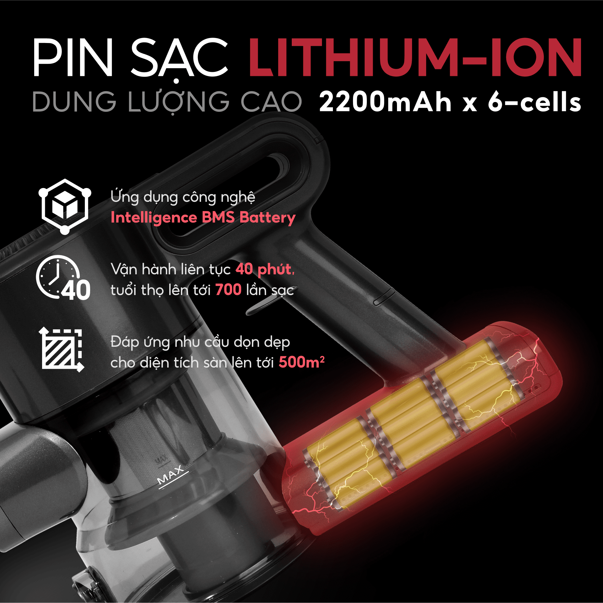 - PIN THÁO RỜI LINH HOẠT: Pin dung lượng cao 2200 mAh cho phép sử dụng liên tục lên đến 40 phút và dễ dàng thay thế khi cần
