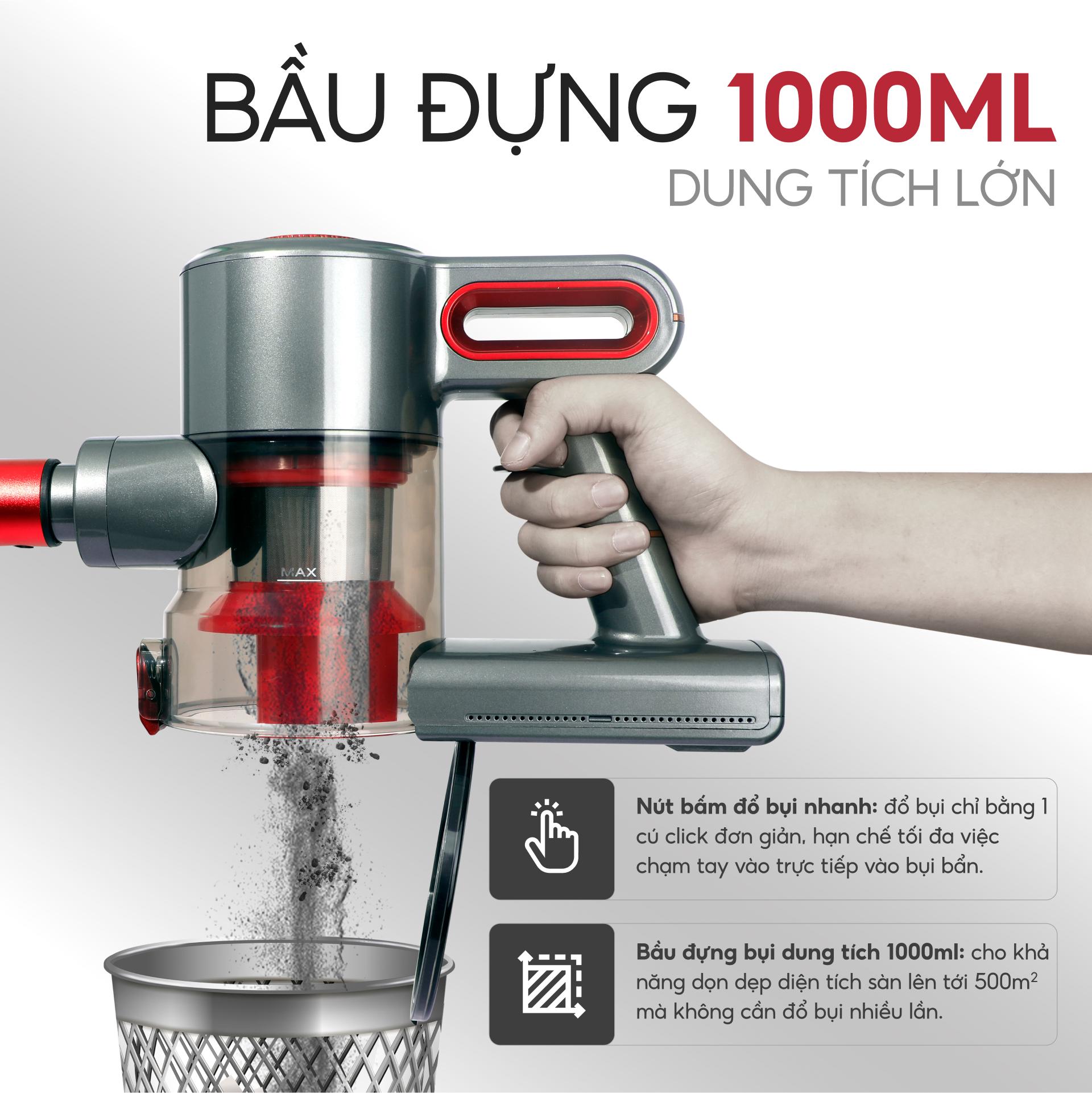 - Bầu đựng bụi siêu lớn 1000ml (tăng 43% dung tích chứa cũ): Dọn dẹp diện tích rộng mà không cần đổ bụi nhiều lần.