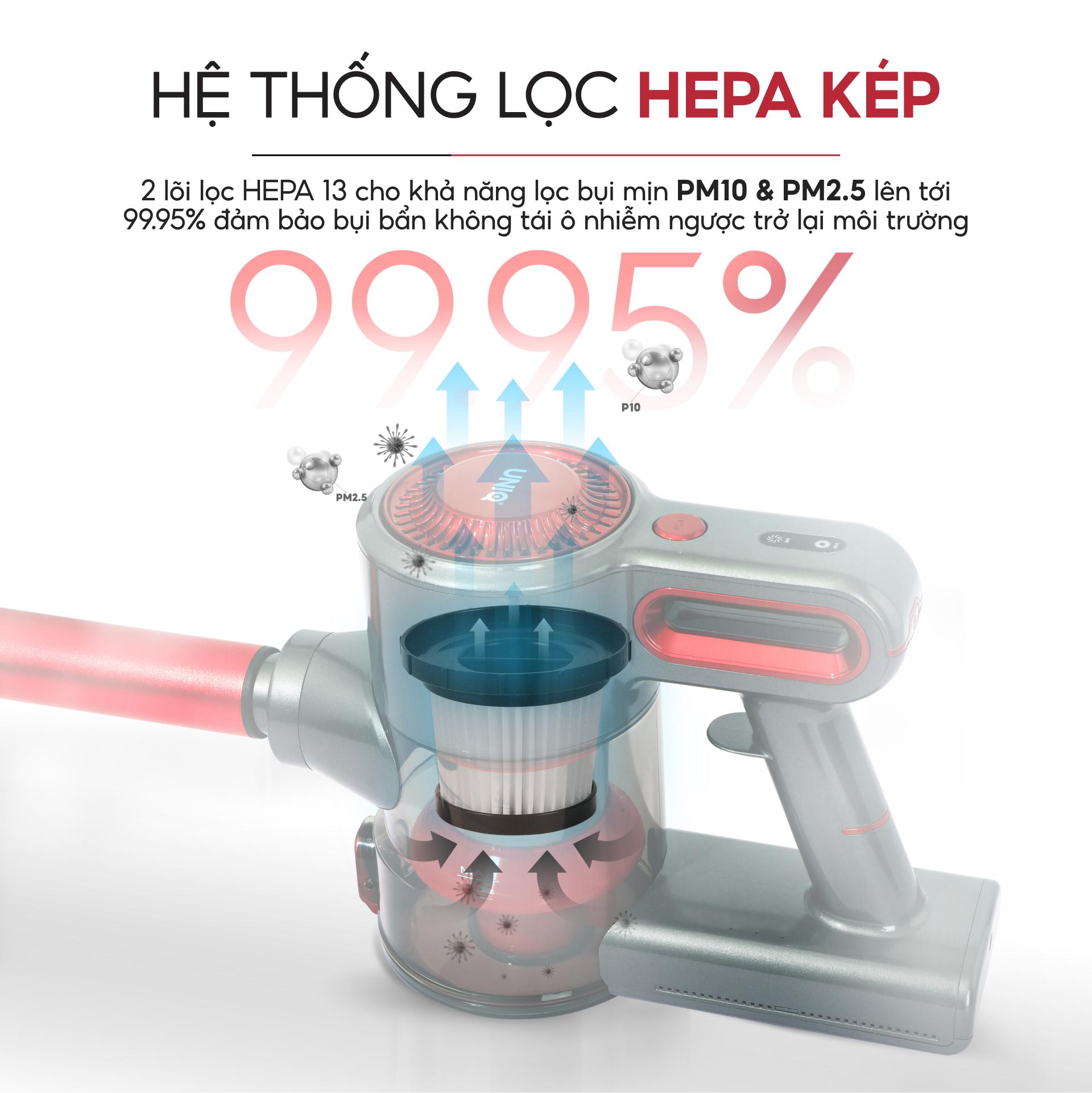 - MÀNG LỌC HEPA KÉP ĐẦU RA & ĐẦU VÀO lọc sạch 99,95% bụi mịn PM10 và PM2.5 có kích thước từ 0.3 micron, mang lại không khí trong lành, an toàn cho sức khỏe