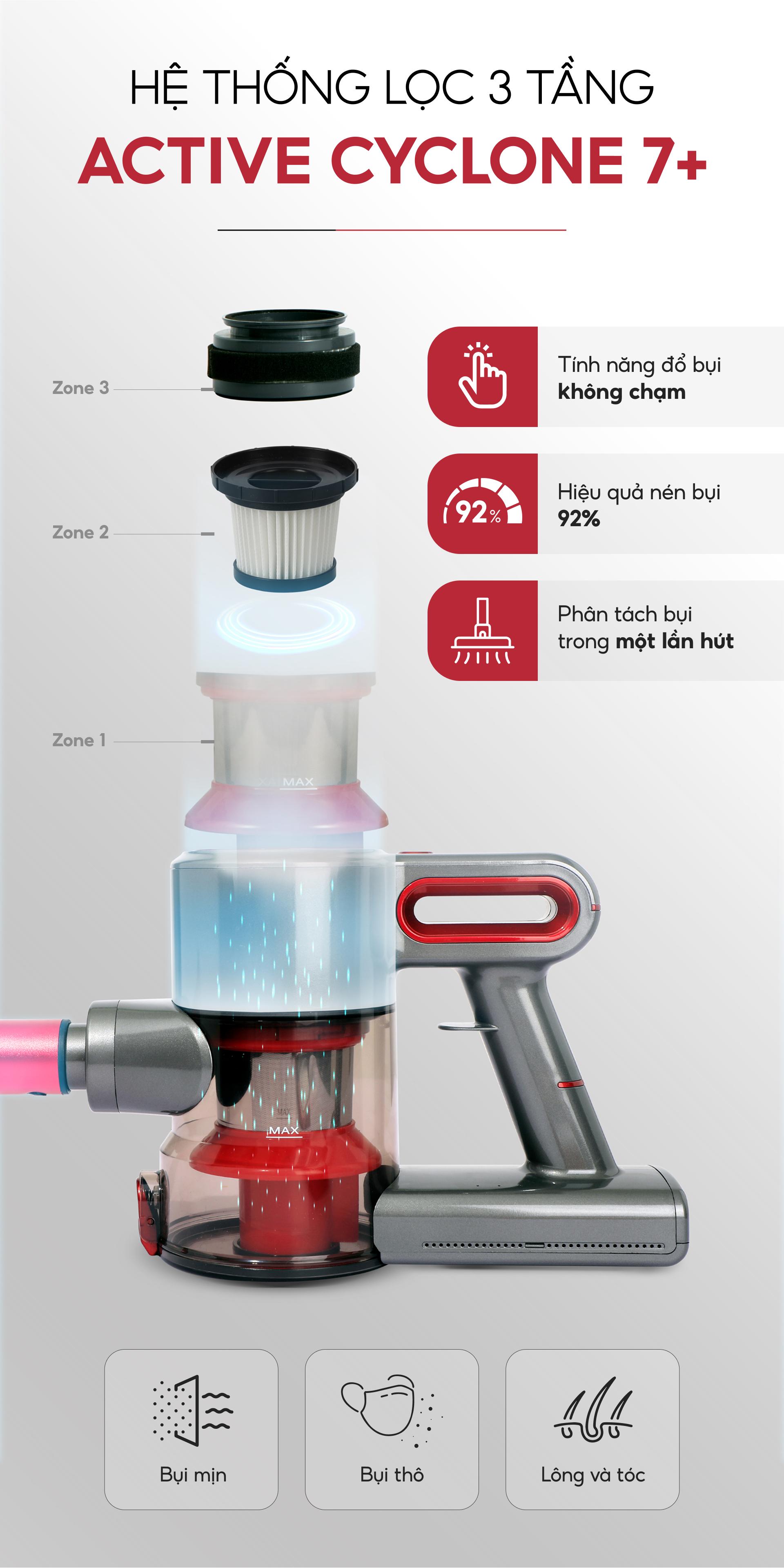 - HỆ THỐNG LỌC ACTIVE CYCLONE 7+: Phân tách bụi bẩn thành ba loại (bụi thô, lông tóc, bụi mịn), nén bụi mạnh mẽ giúp tối ưu khả năng đựng bụi