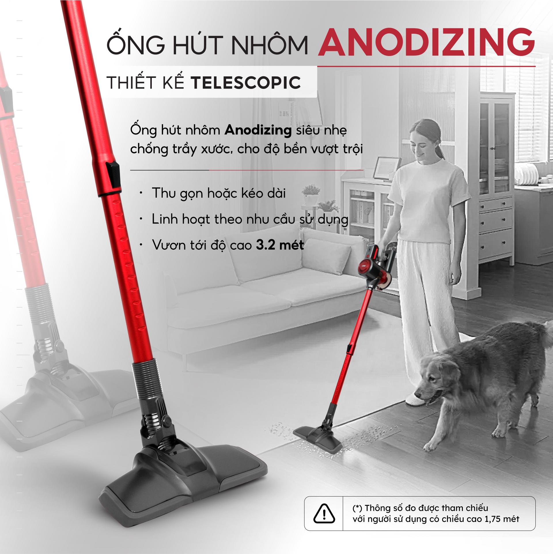 - ỐNG HÚT NHÔM TELESCOPIC: tùy chỉnh độ dài phù hợp nhu cầu sử dụng, dễ dàng tiếp cận những vị trí cao như nóc tủ, rèm cửa hay trần nhà