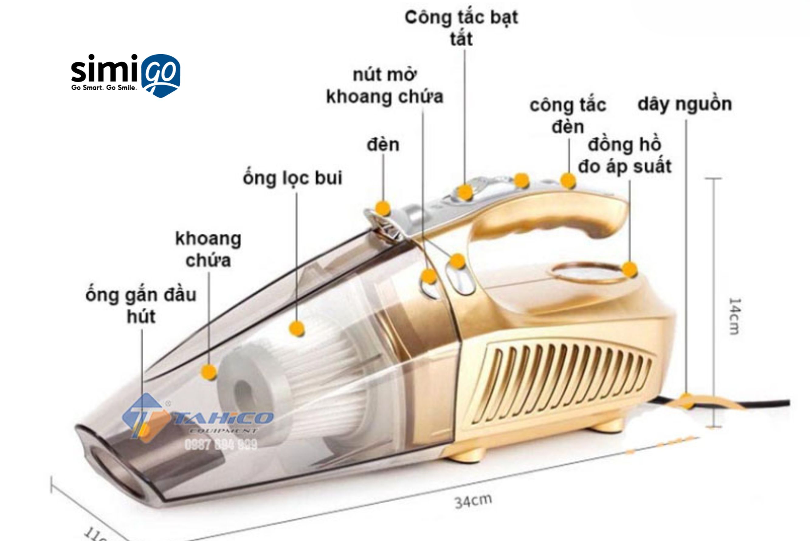Thiết bị này hoạt động trên nguồn điện 12V, có thể sạc trực tiếp từ nguồn điện của ô tô. Nó được thiết kế để làm sạch các khu vực như cốp xe, thân xe, và ghế ngồi một cách tiện lợi.