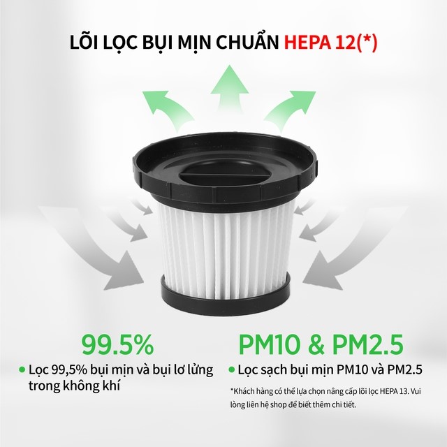 - Máy hút bụi UNIQ Falcon Q5 sử dụng hệ thống lọc kép với 2 lõi lọc HEPA13+, giúp loại bỏ tới 99,995% vi khuẩn và bụi mịn PM10 & PM2,5.