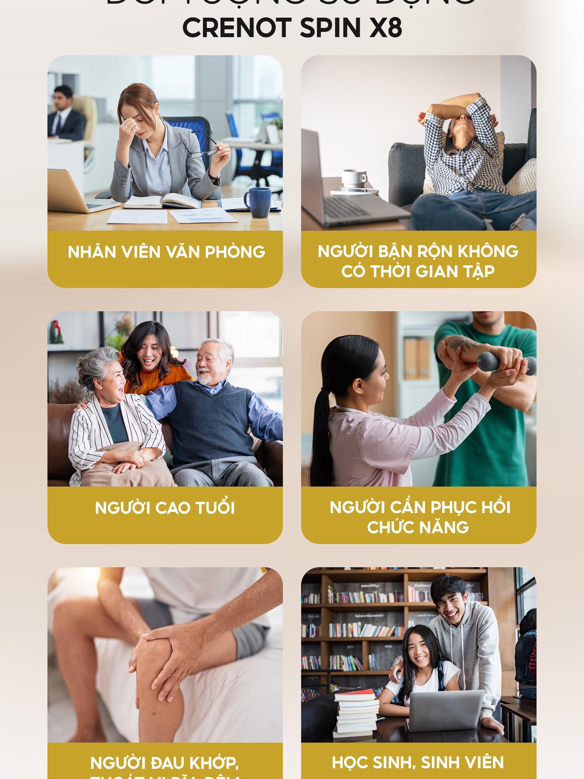 - Hiệu quả toàn diện: Crenot Spin X8 giúp bạn đốt cháy mỡ thừa, giảm cân, tăng cường sức khỏe tim mạch, xương khớp, giúp giảm stress hiệu quả, cải thiện năng lượng và tập trung cho công việc.