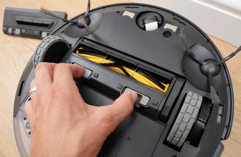 - Khi pin đã được thay mới, lắp lại mặt dưới vị trí của bàn chải quay và hộp đựng bụi vào robot.