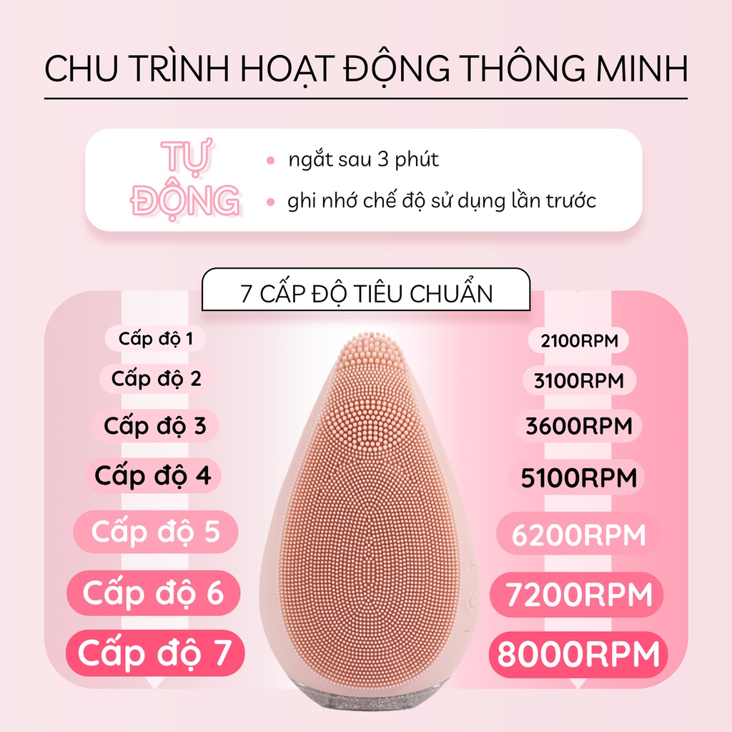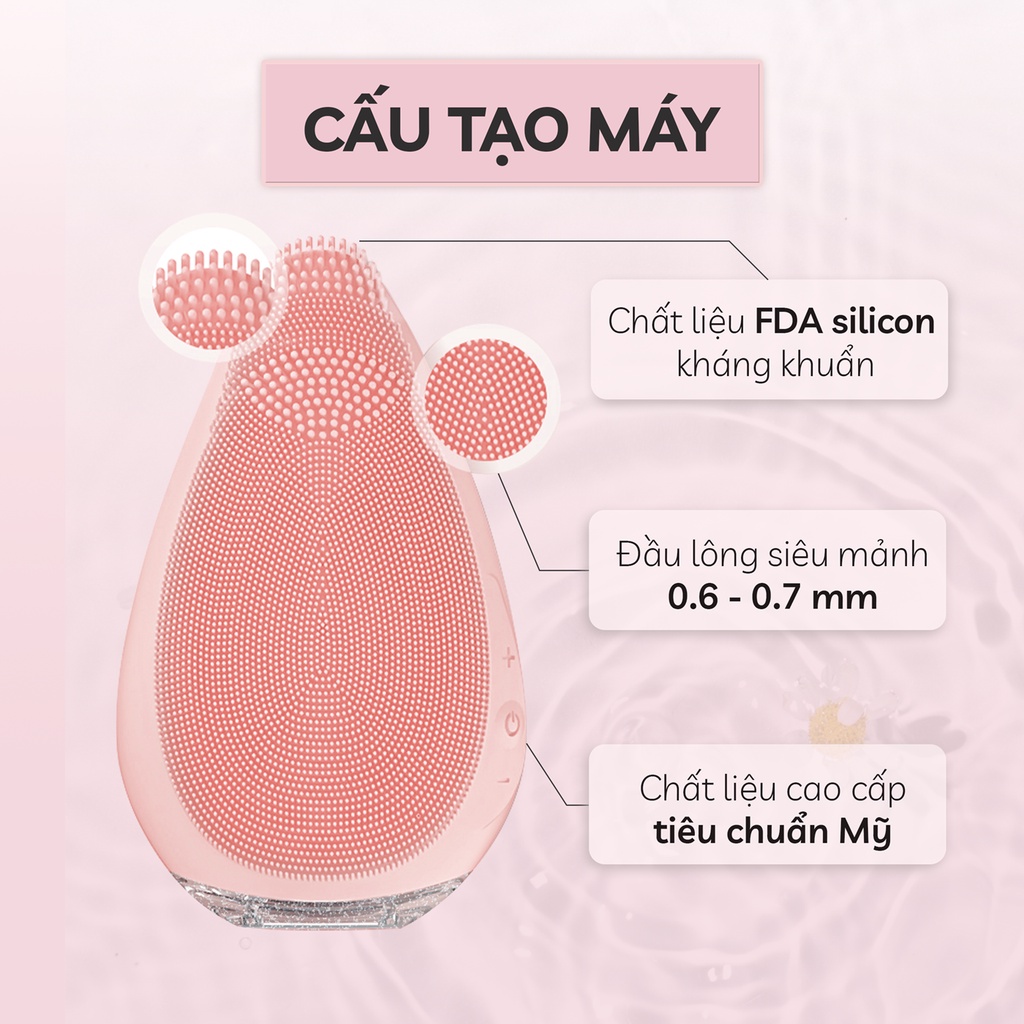 Với những ai có làn da mụn và nhạy cảm thì nên chọn máy có đầu cọ bằng silicone mềm, độ rung nhẹ, công nghệ rung vi vô, kháng viêm, kháng khuẩn.